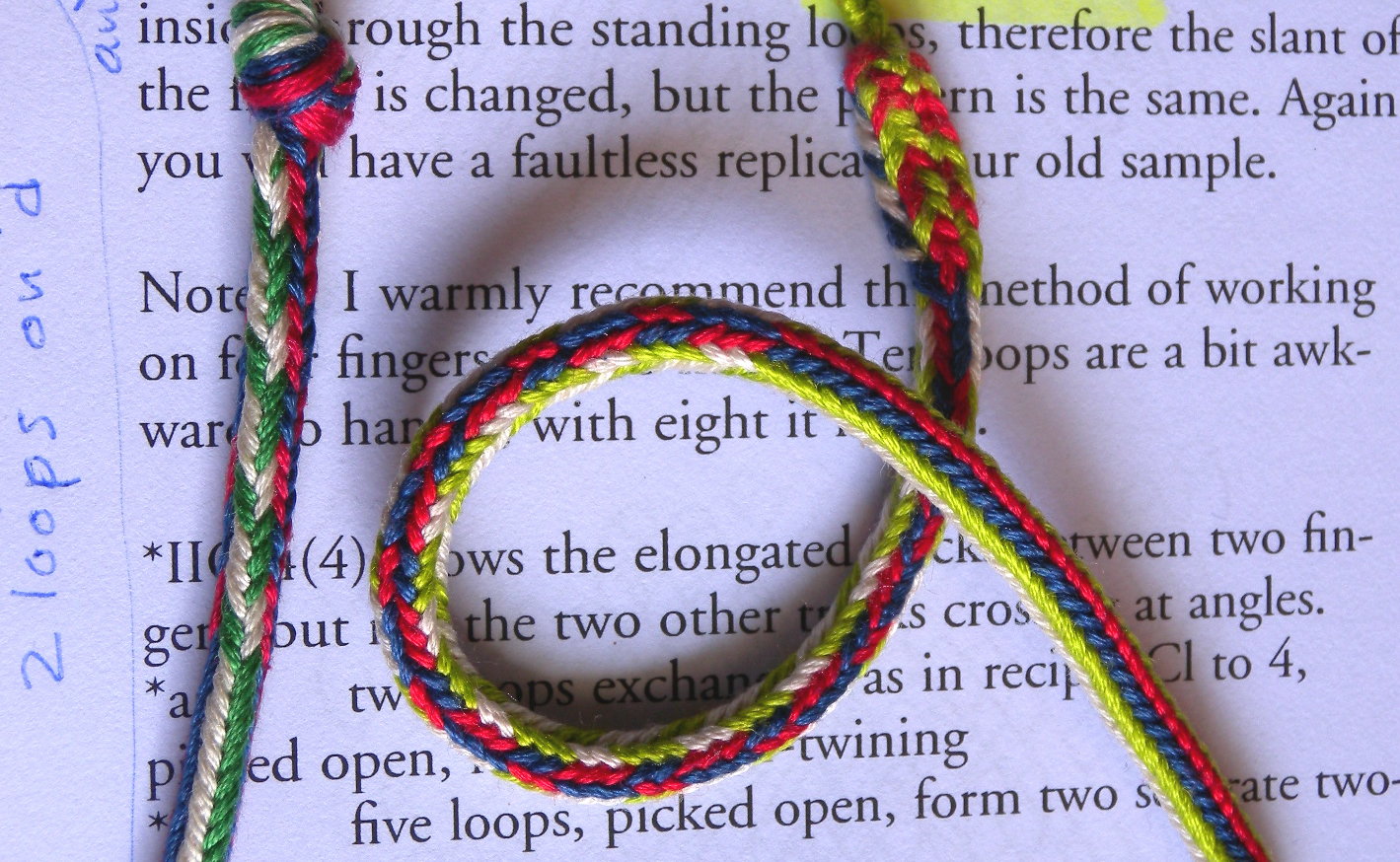 unusual fingerloop braids, 14th Century braids, loop manipulation, early medieval braids,Sudarium-type braids, finger loop braiding, many loops