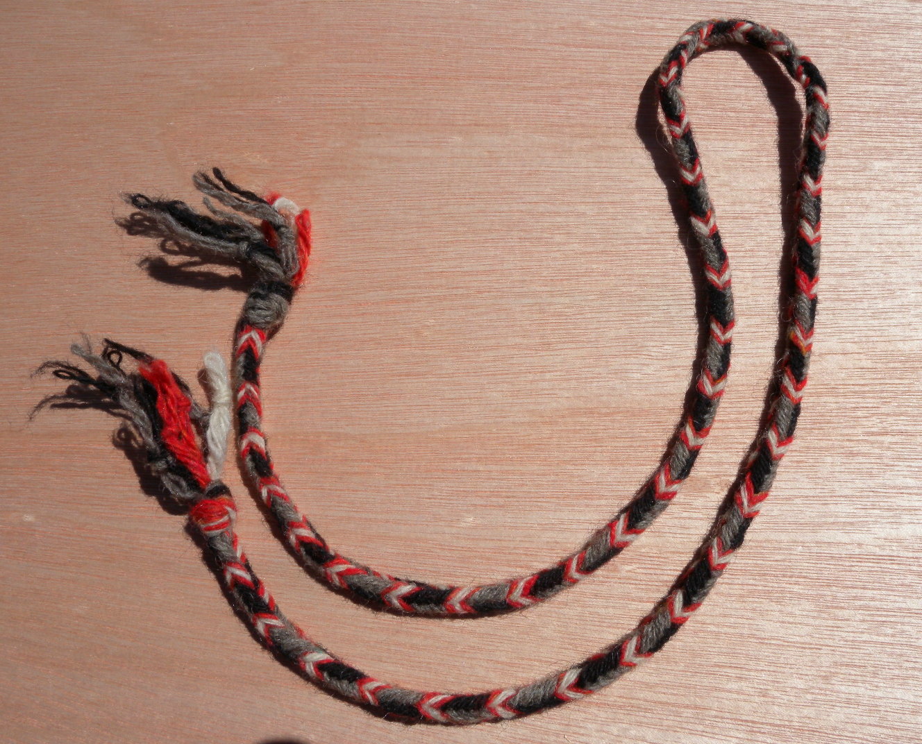 Most of the wool braids below are 7-loop square or flat braids, made out of fairly thin weaving yarn. Being wool, they are already fuzzy, which is not helping the bad photo!