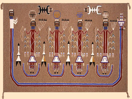 Navajo textile representation of a traditional sandpainting, surrounded by the Rainbow guardian Yeii (“Rainbow Girl”)