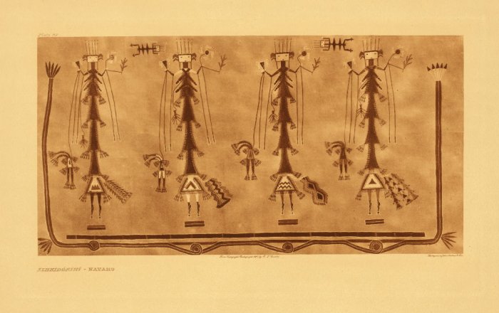 Navajo sandpainting, photogravure by Edward S. Curtis, 1907, Library of Congress–click twice for more detailed view