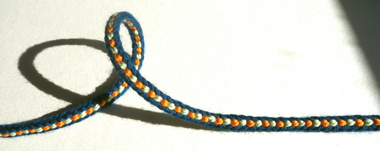 The Barleycorn braid in my photo is made out of navy-colored wool (the square braid part), and orange and white silk yarn (the “spiral” move part).
