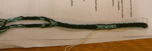 A 2-person braid in which each braider uses orthodox moves on one hand, and unorthodox moves on the other. (My and Dom’s slightly lumpy team braiding)