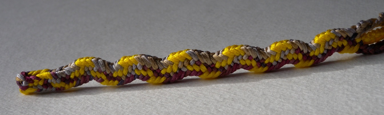 But these curvy braids require color-linking during some of the loop transfers, not at the loop exchange. The orange, yellow and gray flat double braid in my right sidebar→ also has this type of color-linking. In the curvy braids the linking shifts from the left to the right side of the braid, and then back again – which must be the reason the braid ends up being wavy.*² Flat braids with this kind of color-linking end up straight, not snaky. I assume that’s because after the braid is done, and the two layers of the braid are spread open (book-like), any tendency to curve on the left of the midline is cancelled out by the mirror-image tendency for an opposite curve on the right.