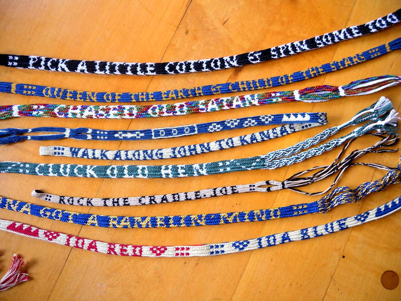 I think the most legible braids are the ones that have the widest spacing—‘Rock the cradle, Joe’, for example which as I mentioned was done with very fine thread. I couldn’t afford to put as much space between the letters in “Chased old Satan”, even though it has fewer letters, because the braid was so bulky. The finer the thread, the more letters (or spaces between) you can fit into the braid, given loops of the same length.