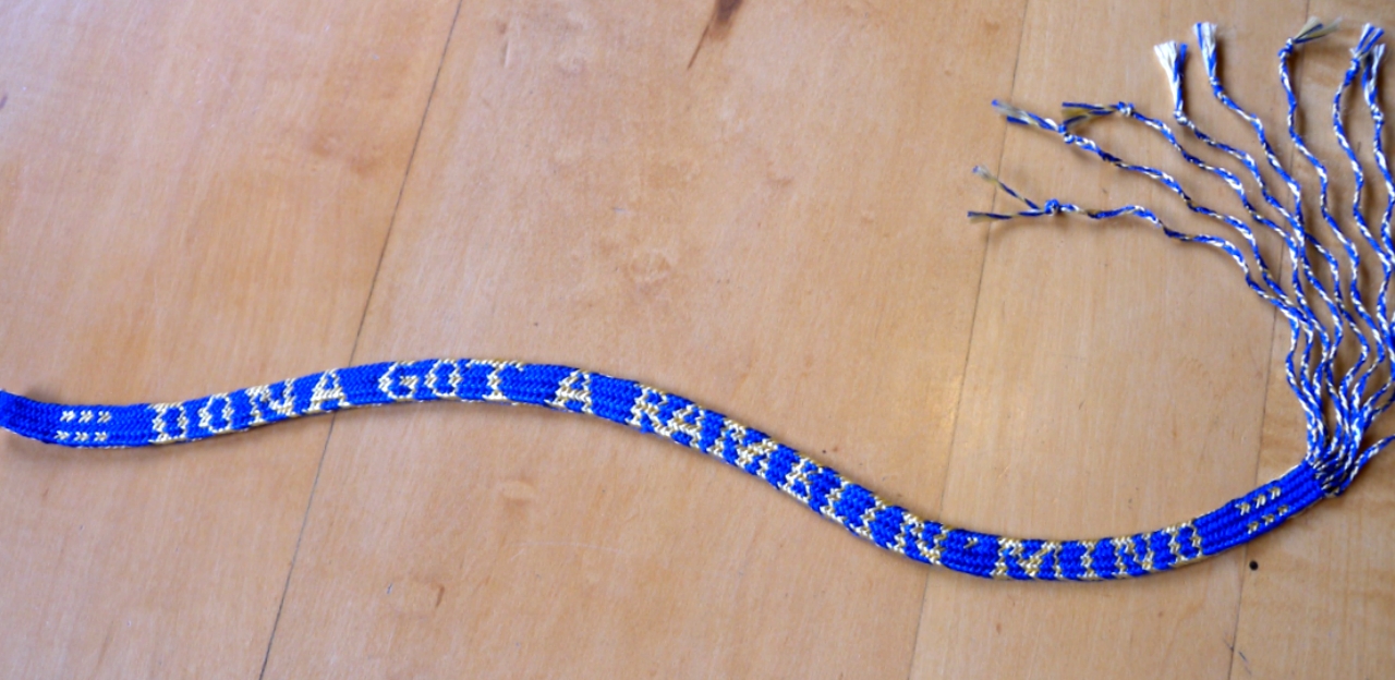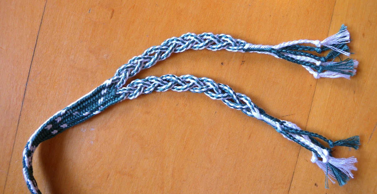 two 18-loop letterbraids, modern variation of a 17th Century finger loop braiding technique