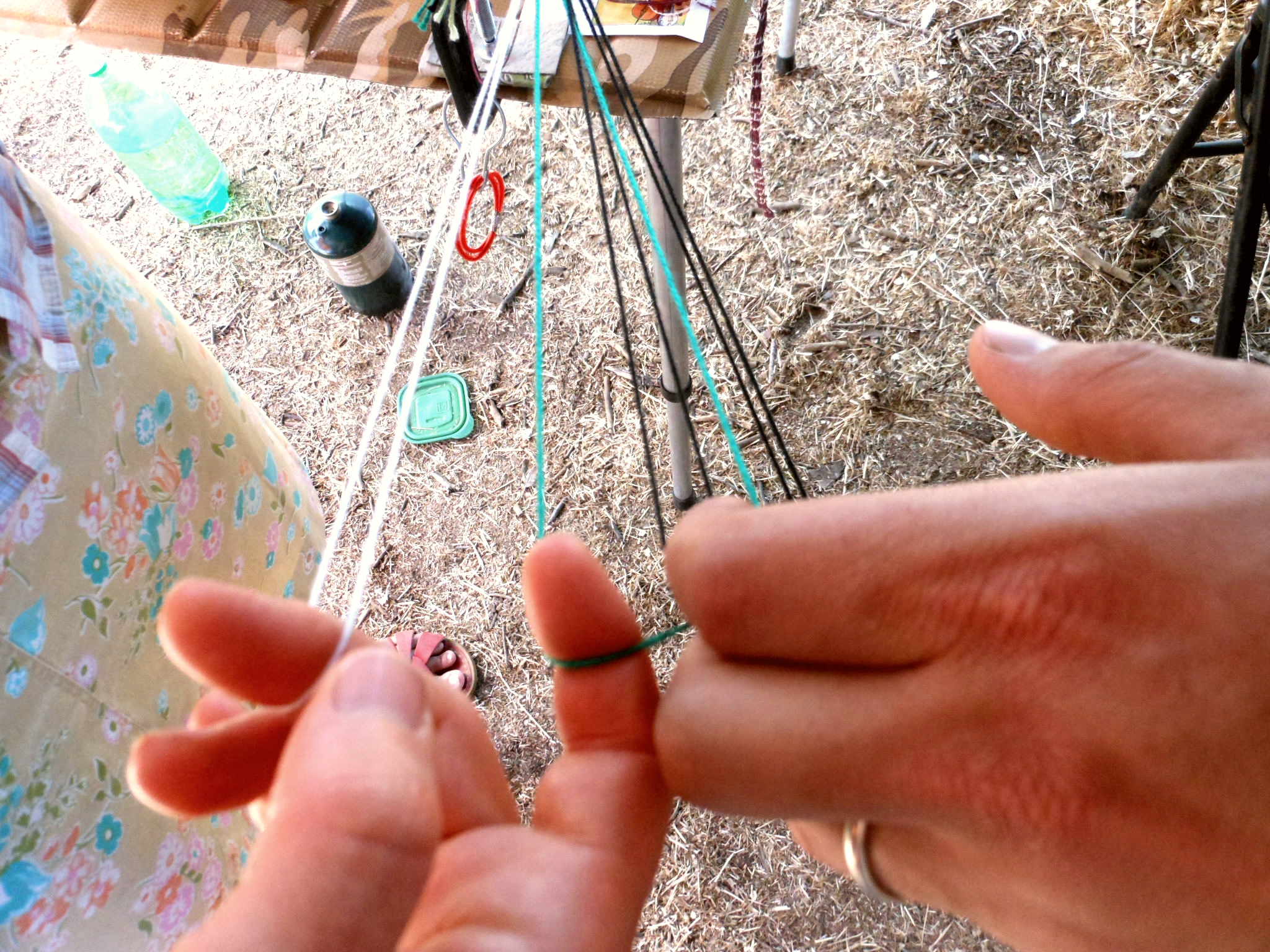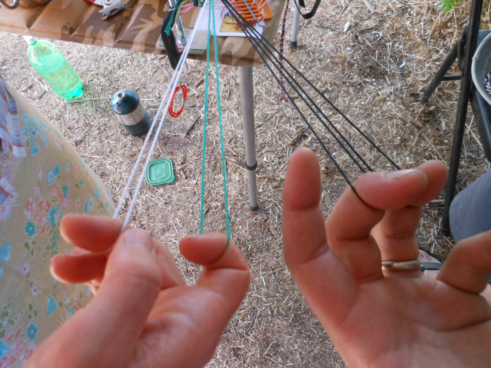 At the first of my two recent music campouts, Amy and Patrick both asked me to show them how to make a 5-loop braid. Right after they had each made one they wanted to learn how to make a 10-loop double braid by team braiding. This was their own idea, and in fact I was slightly shocked. I had mentioned double braids to them when they were looking at my braid samples, but I never expected they would want to learn them right away! I almost told them they should practice more first and learn team braiding tomorrow…Then I remembered they were musicians and I might never see them tomorrow. This was my golden opportunity to get a video!