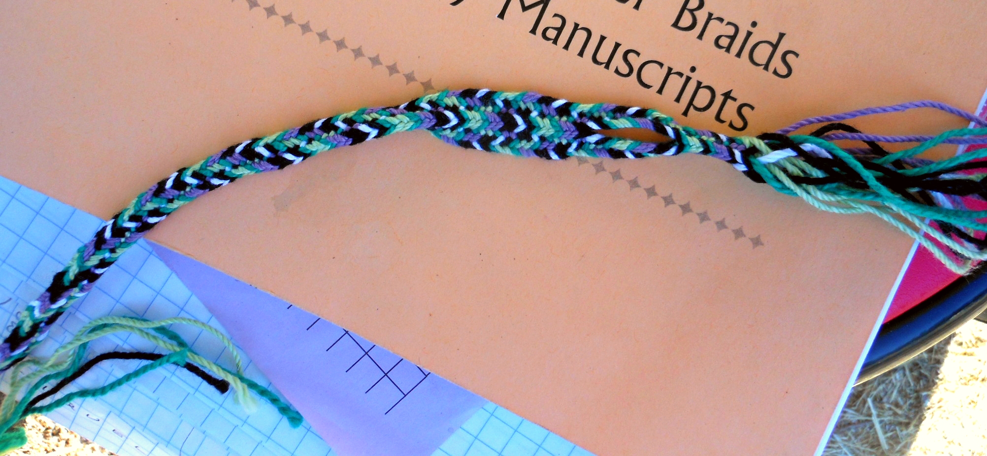 Note: This loop exchange works essentially the same way, regardless of the braiding method you are using – here Amy and Patrick are using the ‘V-fell’ braiding method I teach for square braids, but the loop exchange between the two braiders would be done in essentially the same way even if they were using the ‘A-fell’ braiding method taught on fingerloop.org and other sites.