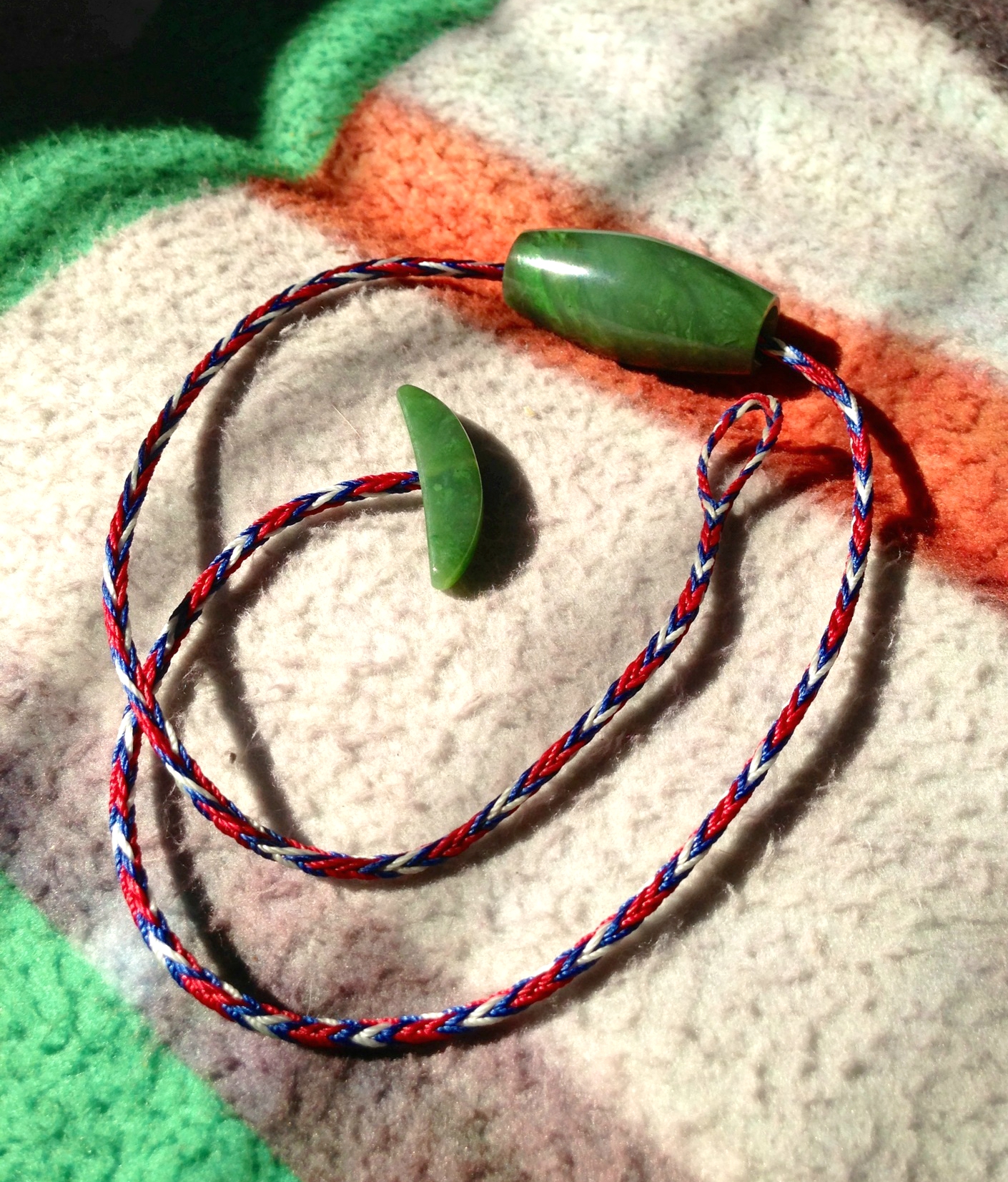 Since that first week, Chris has been making even more. Great color combinations, and meticulously-made braids! I love his closures—those bold beads make great-looking toggles. The toggles and beads are high-quality jade, made by Allan Spehar, a friend of Chris’s. The way Chris sometimes forms a loop by doubling the braid over and tying it down with a tight, neat whipping makes a strong loop as thick as the rest of the braid, and also covers any messy bits at the end of the braid. (In a class I took from Marion “Jewels in Fiber”, she recommended using a tiny drop or two of strong glue as well.)