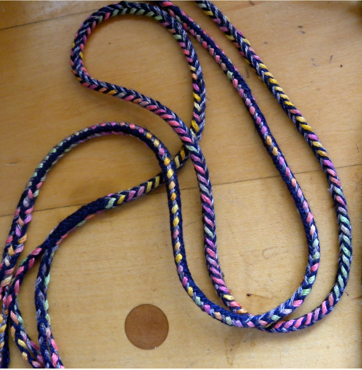 I actually like this braid a lot, but am slightly embarrassed to show pics of it! My green, purple and (I think) the red loops were fine gauge linen, while the white loops were a very slippery fine gauge silk twist, which was a bad combination of textures. The silk and linen tended to slip over/ under each other and get ‘lost’, so this braid looks a little sloppy to me. I think the pattern would stand out more clearly with embroidery floss or other threads that are less slippery than this combination.