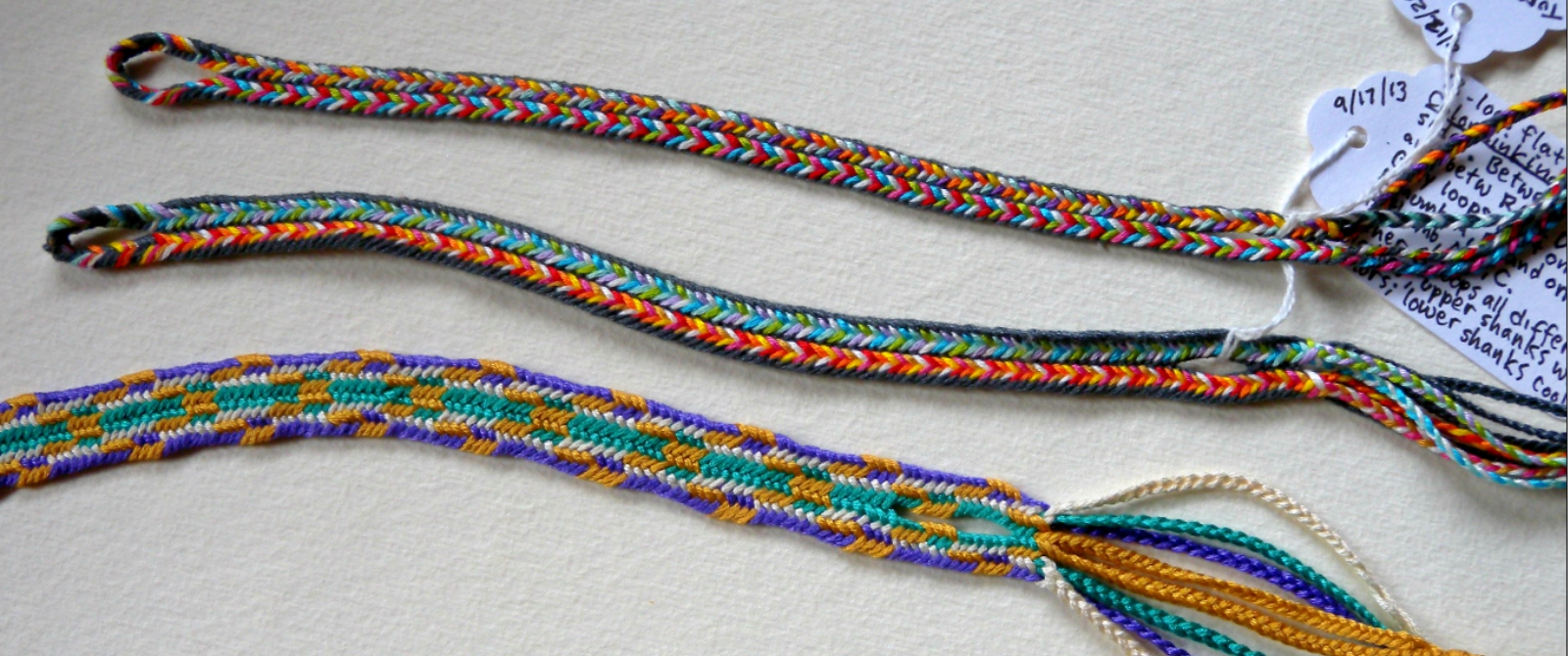 Three complex fingerloop braids of 9 to 15 loops. Loop manipulation, color-linking