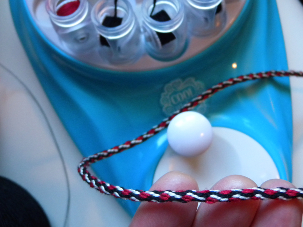 (Btw: the braids in photo below are sorta ‘hacked’ – the machine and its included spools make braids more like the magenta/blue/orange bracelet in photos further down.)