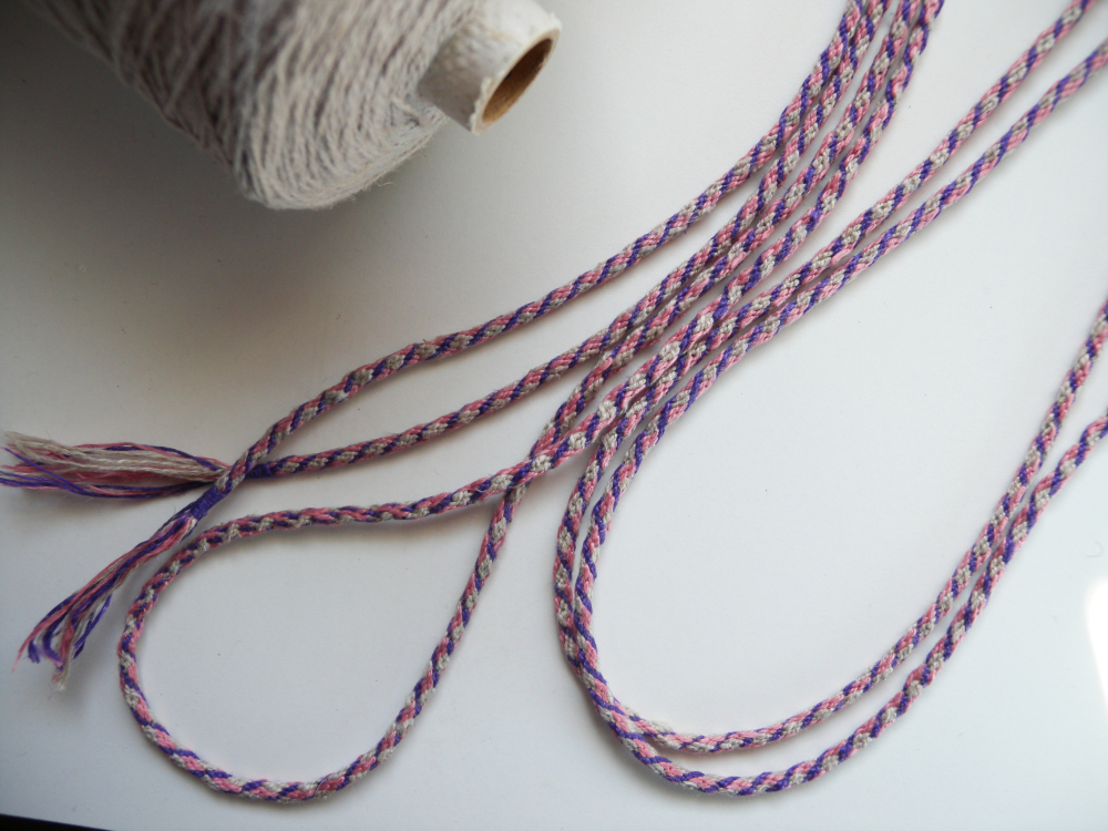 Left-to-right, from lower left corner: 1st braid is the thickest, crochet cotton #3 (3-ply); braids 2-5 are fine weaving wool (discontinued brand); 6-12 are dmc embroidery floss. (#9 and #11 have a single spool of pink rayon thread)