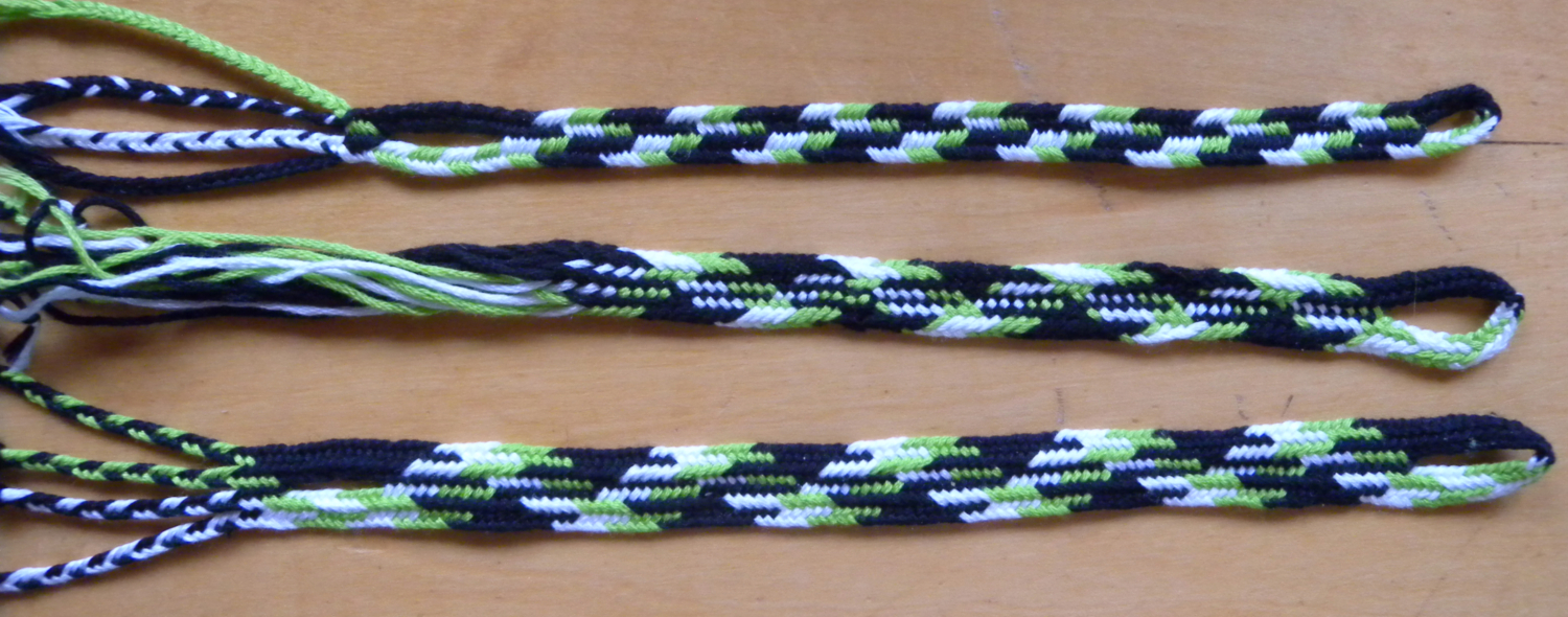 The 9-loop flat ‘square’ braid has 4 green/black bicolor loops and 5 white/black bicolor loops.