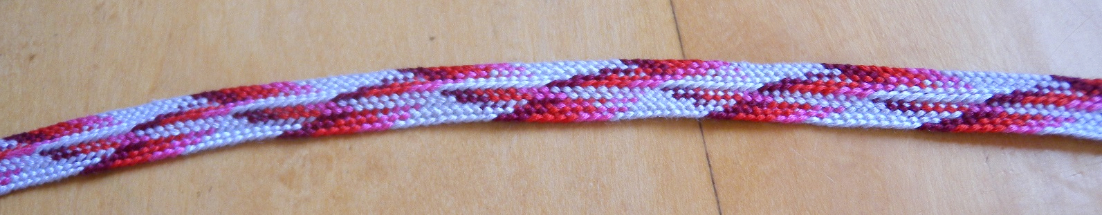 My first photo (above the navy/white braid) is of a flat 10-loop ‘letterbraid’ that has a multicolor 50/50 zig-zag of three reddish colors on a light gray background (3 bicolor loops of pink/gray; 4 of red/gray; 3 of wine/gray). Below are two 7-loop flat braids with multicolor 50/50 zig-zags. Both were made with 3 black/white bicolor loops and 4 red/white bicolor loops.