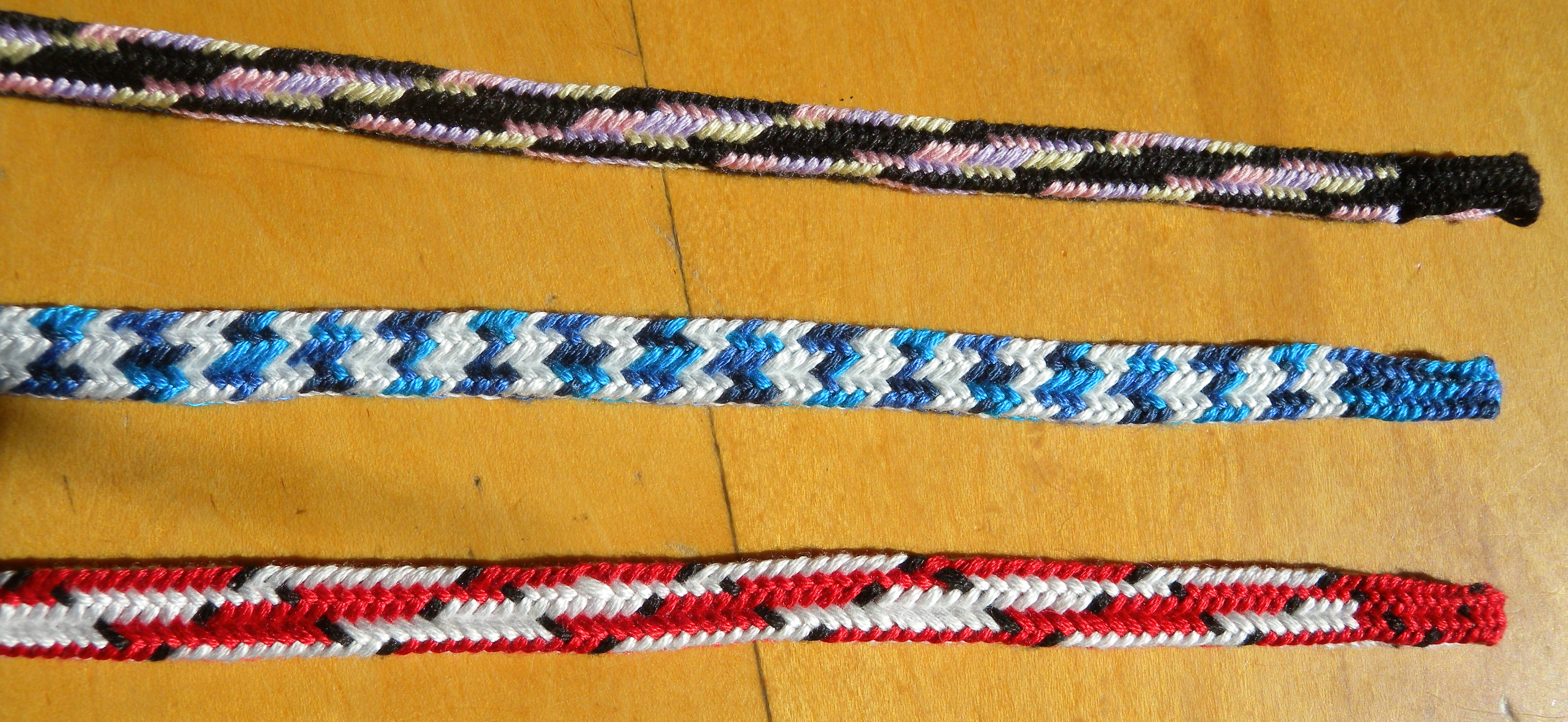 Aside from the more familiar example of flat braids, I first stumbled onto this type of asymmetrical color-pattern back when I was experimenting with double braid variations. Double braids have 4 loop transfers in each cycle, or row, of braiding. At least 3 possible double braids require an odd number of turned loop transfers: the Flat double braid, the Half-hollow double braid, and the Single Side-slit double braid. (I teach the last two in my article on Double Braids in the Braids 2012 Conference Proceedings book Threads That Move, see photos from article below, and links to sites that carry the Proceedings book in sidebar.) The latter two double braids require 3 turned loop transfers and a single straight loop transfer. Because of that ‘oddness,’ their bicolor-loop color-patterns are very asymmetrical, with pattern repeats that are twice as long as those of a solid rectangle double braid (20 cycles rather than 10 for a 10-loop braid):