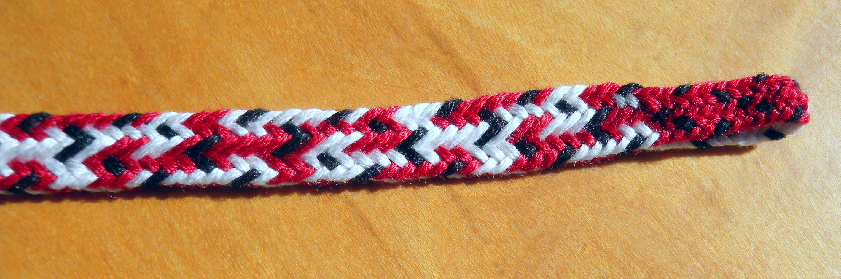 The shadow under this braid makes it hard to tell that the top half of the braid has a wider black edge along the left side than along the right. (Visible if you click to enlarge the photo twice.)