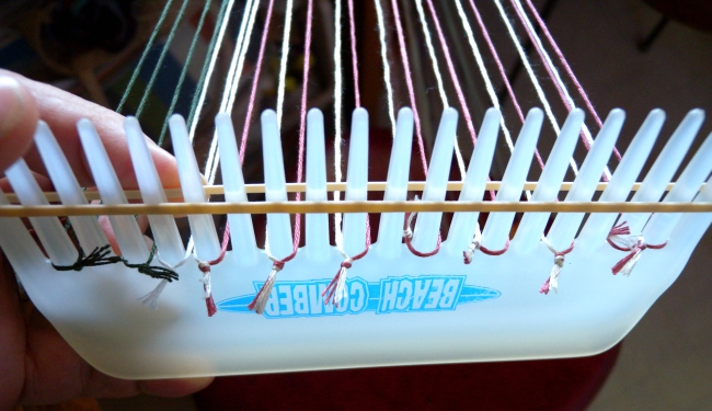 Closeup of loops on a comb. Other end of each loop would be mounted on a second comb, in parallel fashion. Loops do not need to be stretched tight like this between the two combs.