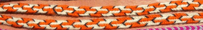 Now, when you continue braiding with V-fell moves, the braid won’t undo. And amazingly, there will be (almost) no visible irregularity at the junction between the two halves of the braid, even though the angles of the threads will reverse themselves at that point. For a flat braid, you need to be sure that you are making the one turned transfer on the correct side – this might well seem like the opposite side than before, because the braid will probably be turned around, now, so if you were turning the left transfers before, now you will be turning the right transfers. There will be a symmetrical float of two threads at the join—see photo below. (I suspect those centerpoint floats would have been less glaring if I had made the turnaround point in a white/orange area instead of at the one all-black loop.) But there won’t be a bump or round god’s-eye-like section at the join, and a flat braid will still open out to be perfectly flat there at the midpoint join area.