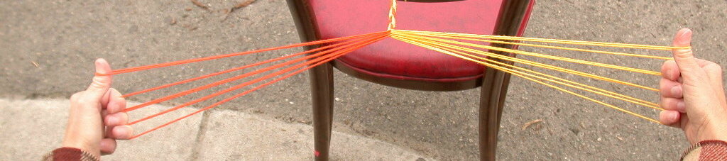 I have occasionally been asked for the names of my braiding methods, I guess on the basis of the so-called A-fell, V-fell and Slentre methods. I guess you could call them “thumb methods” since I use my thumbs in making any braid of more than eight or nine loops. I figured out how to use thumbs on my own, but others have done it before me–it has been done in Finland, China, and probably elsewhere, as well as by the braider who first taught me a five-loop square braid here in the U.S.