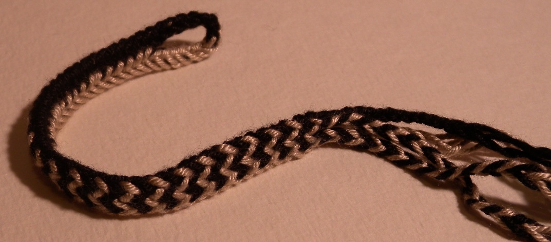 No bicolor loops. The grey and white ‘W’ pattern can only be made with 8 loops, not 6 or 10 (but 6 or 10 loops will make a nice non-W pattern). I used embroidery floss, but doubled the strands to make a bigger braid.