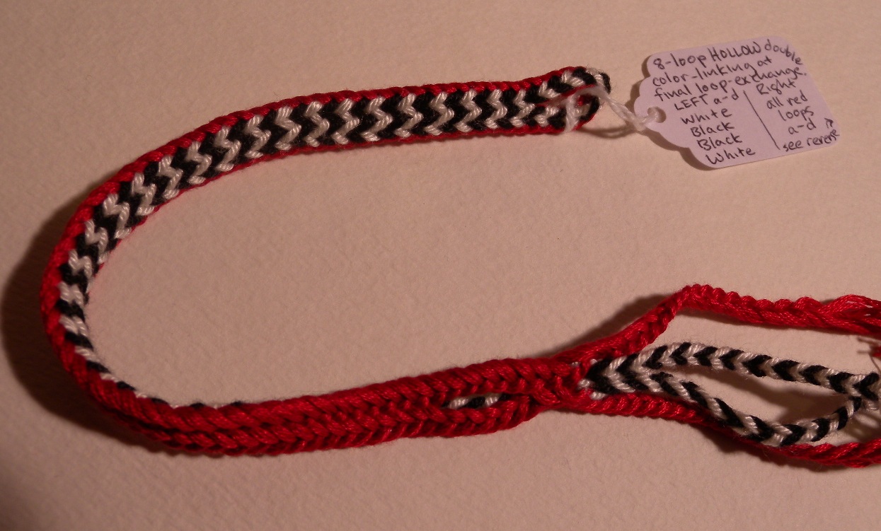 This 8-loop hollow braid has color-linking at the final loop exchange of each braiding cycle, as taught in my flat double braid post. That keeps the left hand’s grey and white loops on the left hand, and the right hand’s pink loops on the right, making each side a different color. Here, in a hollow double braid, the two different colored sides of the braid end up seeming like the “top” and “bottom” of the finished braid. During braiding, the braid was on edge, as shown in the photo. The braid also has openwork areas, made by not turning any of the transferred loops for (here) 8 braiding cycles.